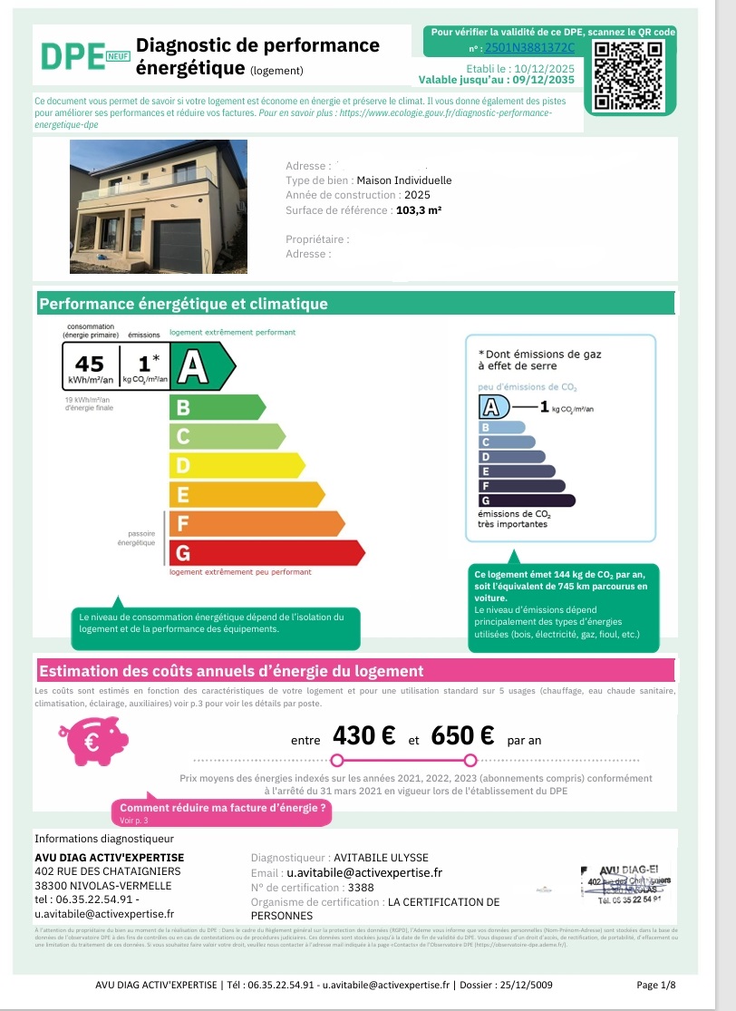 - La description: Pérouges : Réf 00065 :les côtes d’en bas.Villa neuve de 2025, conforme à la norme RE 2020, offrant 103 m² habitables. Elle se compose d’un hall d’entrée, d’une cuisine aménagée ouverte sur un séjour-salon lumineux, d’un WC suspendu avec lave-mains, ainsi que d’un cellier. À l’étage, la maison propose trois chambres, dont une suite parentale et une seconde équipée d’un dressing. Une salle de bains complète l’étage avec douche et double vasque. La propriété bénéficie également d’un balcon et d'une terrasse de 100 m² et est édifiée sur un terrain de 1 000 m² dont une partie en pente. À voir rapidement. Belle prestation pour cette maison neuve basse consommation, équipée d’une climatisation réversible, de fenêtres en aluminium avec volets roulants, ainsi que d’un garage isolé. Dpe A Ges: A Consommation énergie primaire : 179 kWh/m²/an Consommation énergie finale .Prix de vente : 390 000 € honoraire à la charge du vendeur. Estimation du coût annuel énergie pour un usage standard est entre 430C € à 650€ par an prix moyens des énergies indexés sur les années 2021,2022,2023. Les informations sur les risques auxquels ce bien est exposé sont disponibles sur le site Géorisques .georisques.gouv.fr .L'agence Tem immobilier ne peut recevoir ni percevoir de fonds, effets ou valeurs que ceux représentatifs de sa rémunération ou de sa commission.